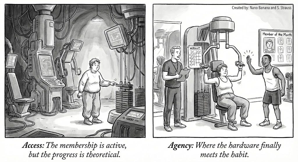Think of this distinction as the difference between a high-end gym membership and an actual fitness transformation: While a keycard provides Access, it’s the structured training program, expert coaching, and personal discipline that truly constitute Agency.